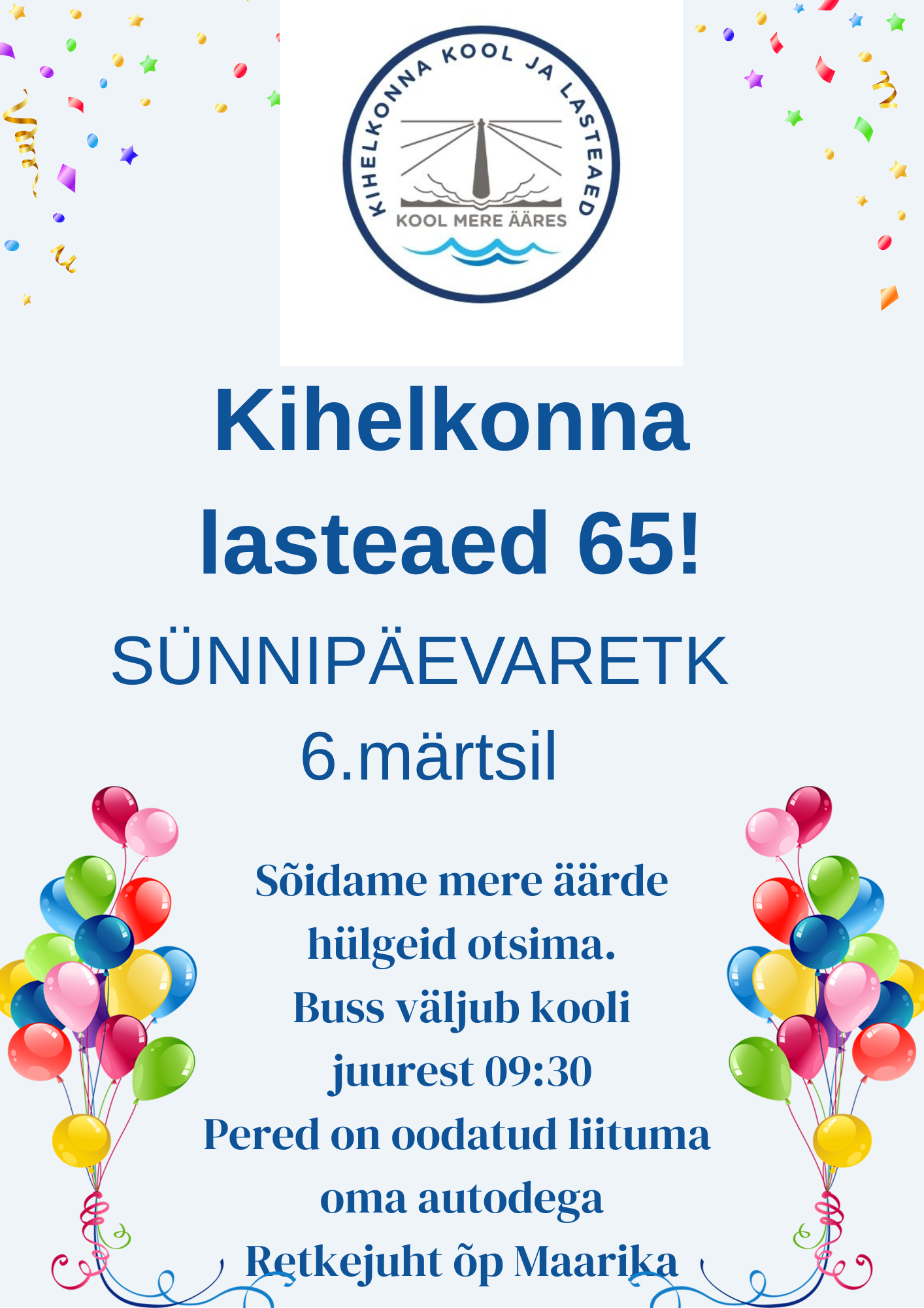 Retkele läheme kõik koos: kooli- ja lasteaiapere, ka emad-isad, kes parasjagu tööl ei pea olema, on oodatud. Tellitud on 23-kohaline buss (suuremat meie kandis pole), lisaks õpetajad oma autodega. Vanemadki võiksid koguneda koolimaja juurde oma autodega.