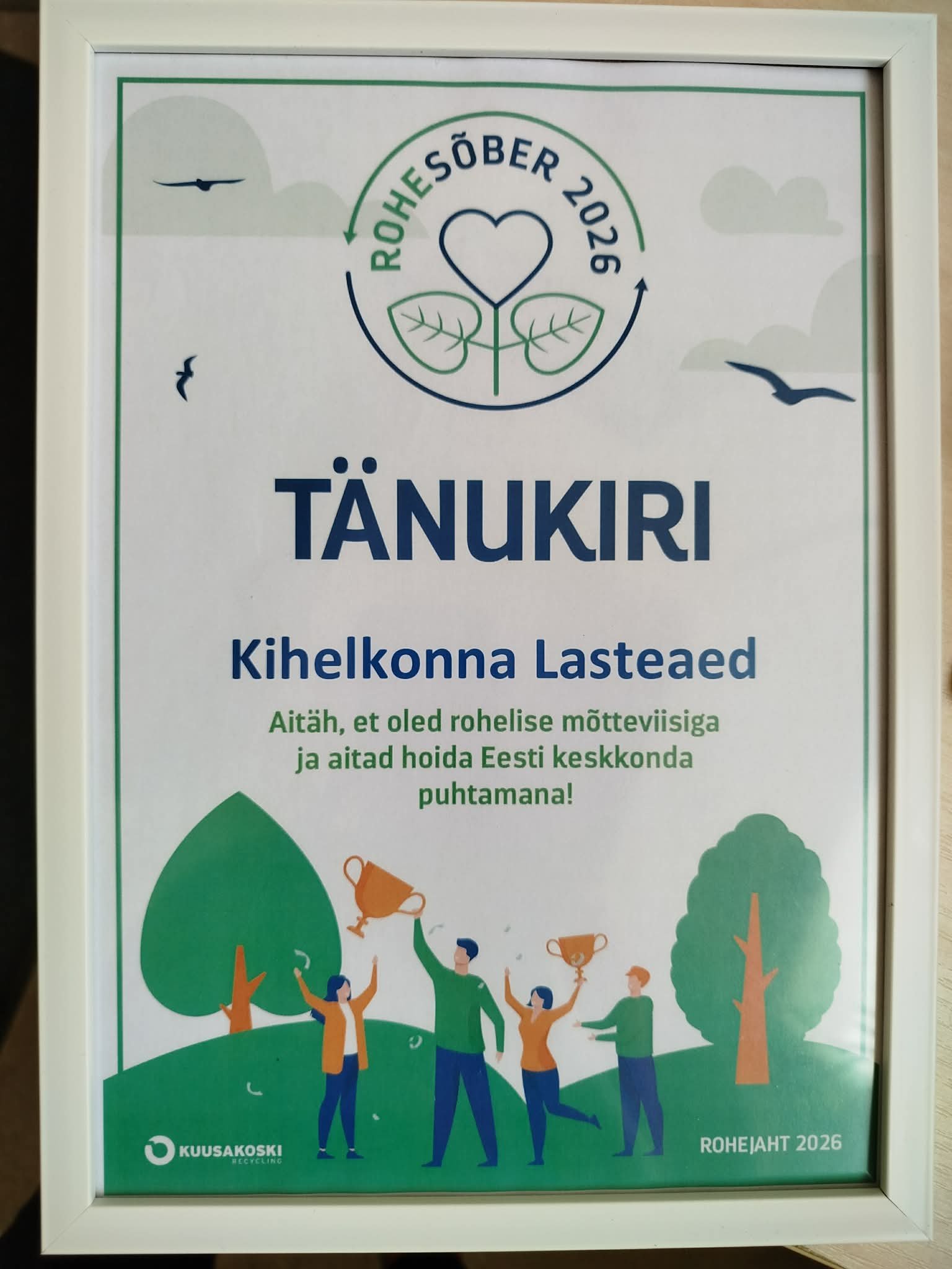 Meie lasteaed osales Kuusakoski korraldatud Rohejahil 1.oktoobrist kuni 31. märtsini. Kogusime küünlaümbriseid, väike-elektroonikat ja fooliumkaasi. Küünlaümbriseid kogunes lausa 6 kg, see teeb 6000 küünlaümbrist! Lisaks 2 kg pisielektroonikat ning kõiksugu muud elektroonika-kraami, mida kodudes enam ei vajata.