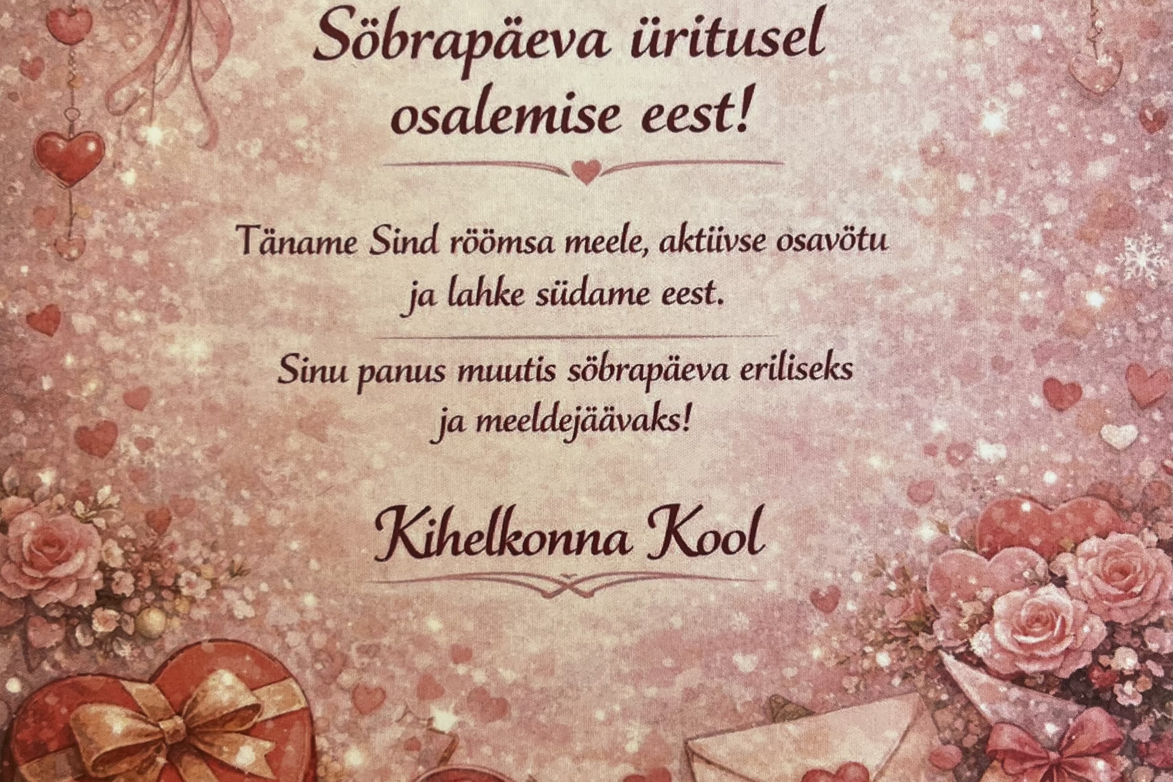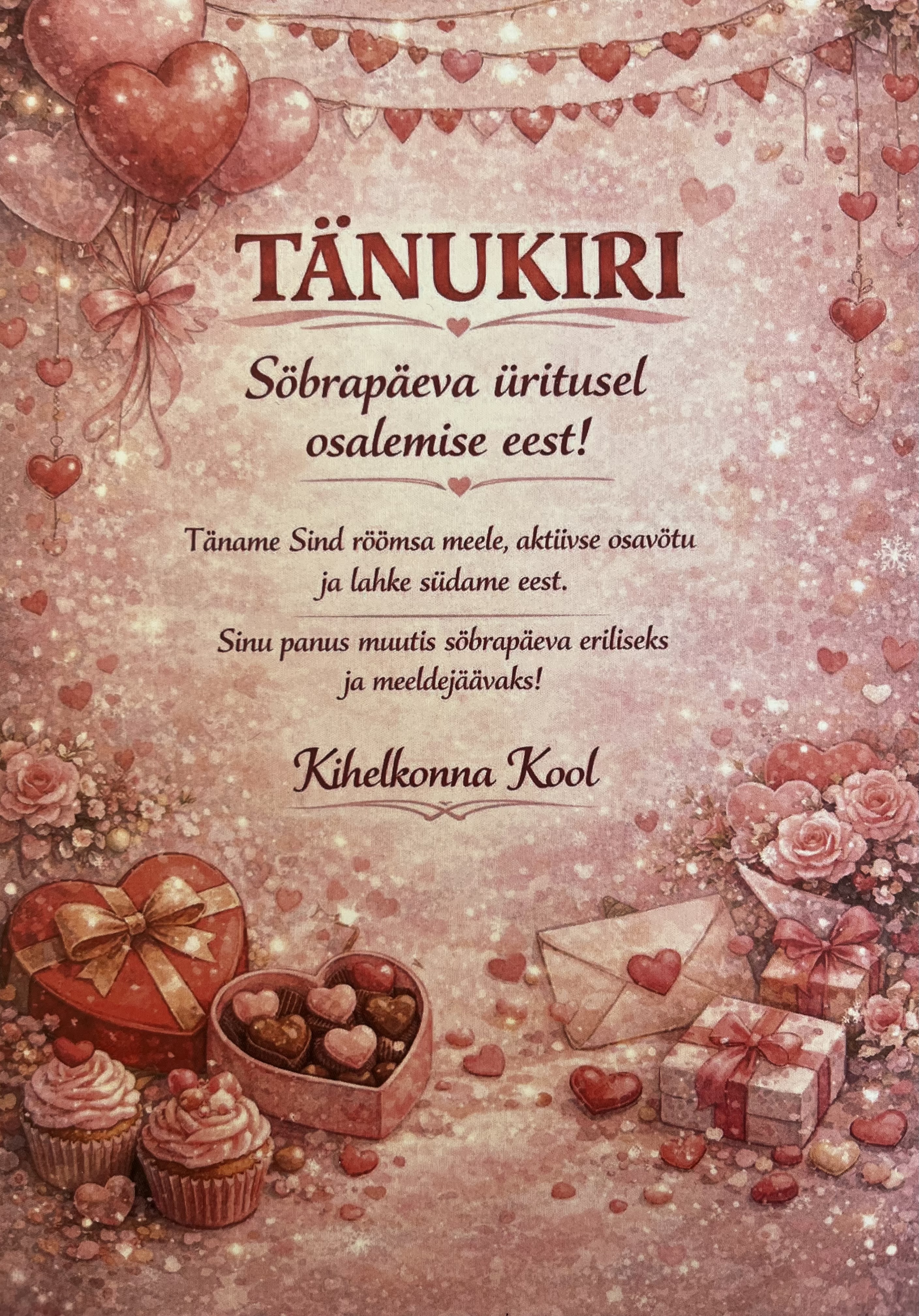 Päev algas loovalt ja koostöiselt: ühiselt meisterdati vahva fotonurk, kus jäädvustati meeleolukaid sõbrapilte. Juba hommikul täitus koolimaja elevusega, kui postkasti poetati sõpradele kaarte ning anti üle hoolikalt valitud kingitusi. Iga väike žest kandis endas suurt tähendust. Tegevusi jagus kõigile – lahendati sõbrapäevateemalisi ristsõnu ja sõnarägastikke, joonistati pilte oma sõbrast ning mängiti ühiselt toredaid mänge. Loomulikult ei puudunud ka tants ja rõõmus liikumine, mis sidus kogu koolipere veelgi tugevamalt ühte.